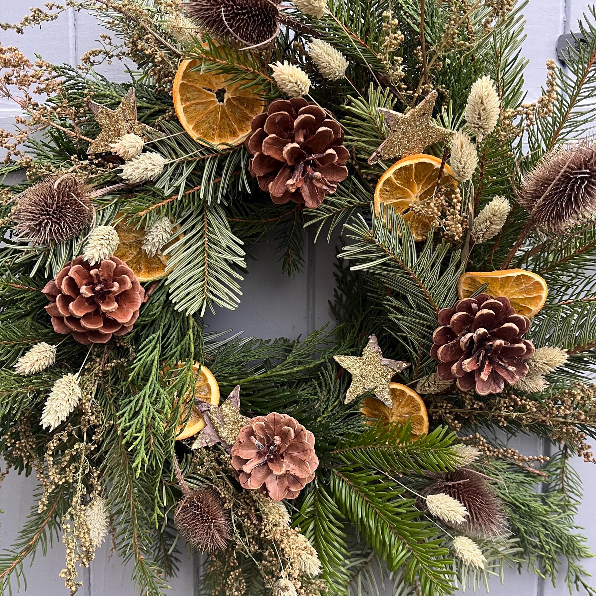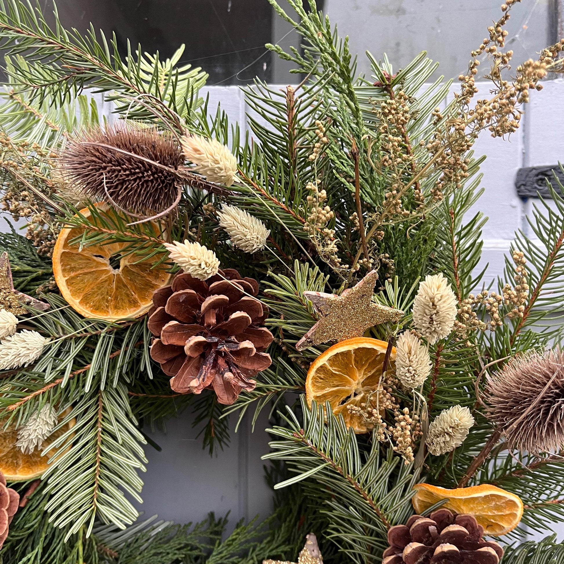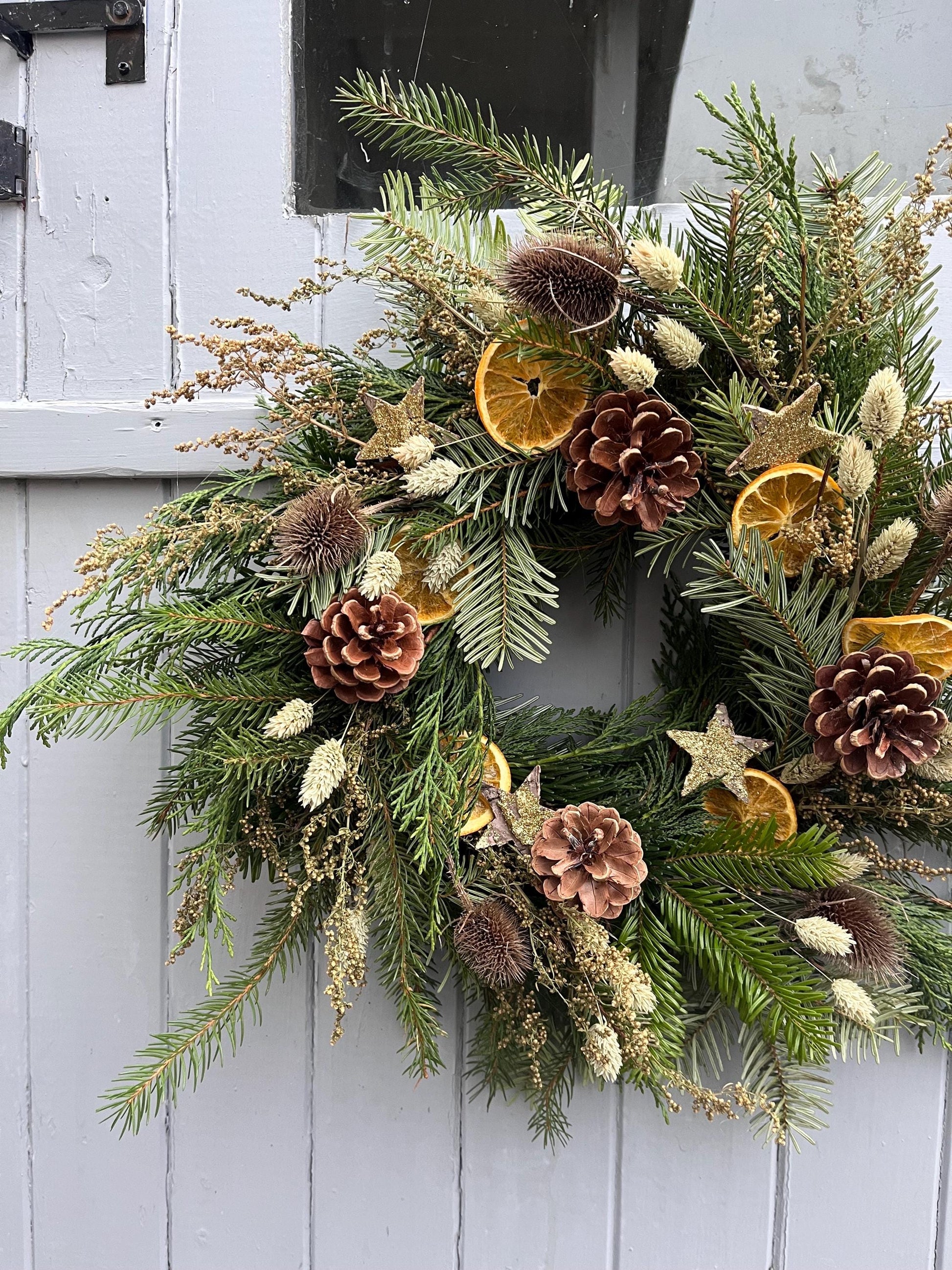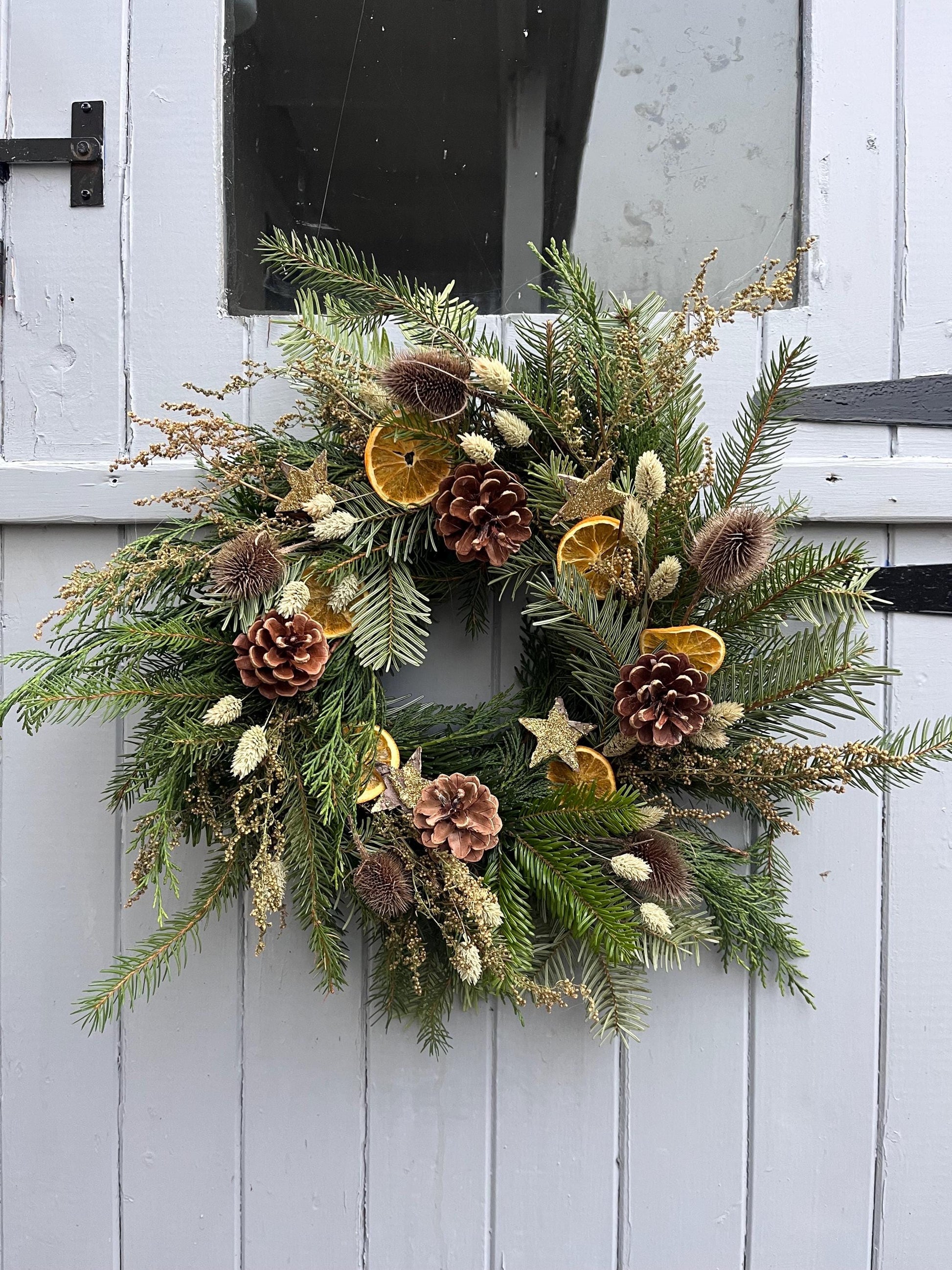 These beautiful handmade wreaths have been crafted with a mix of fresh evergreen foliage and dried flowers and fruits making them the prefect festive wreath
