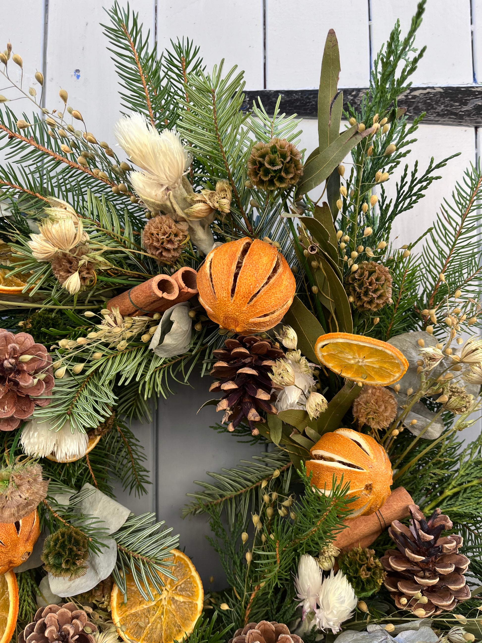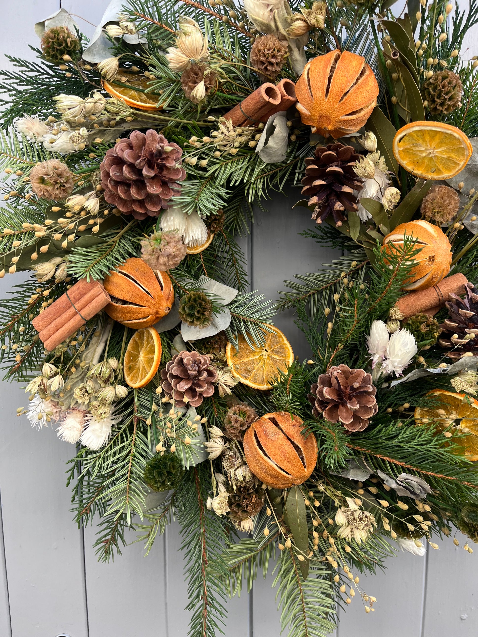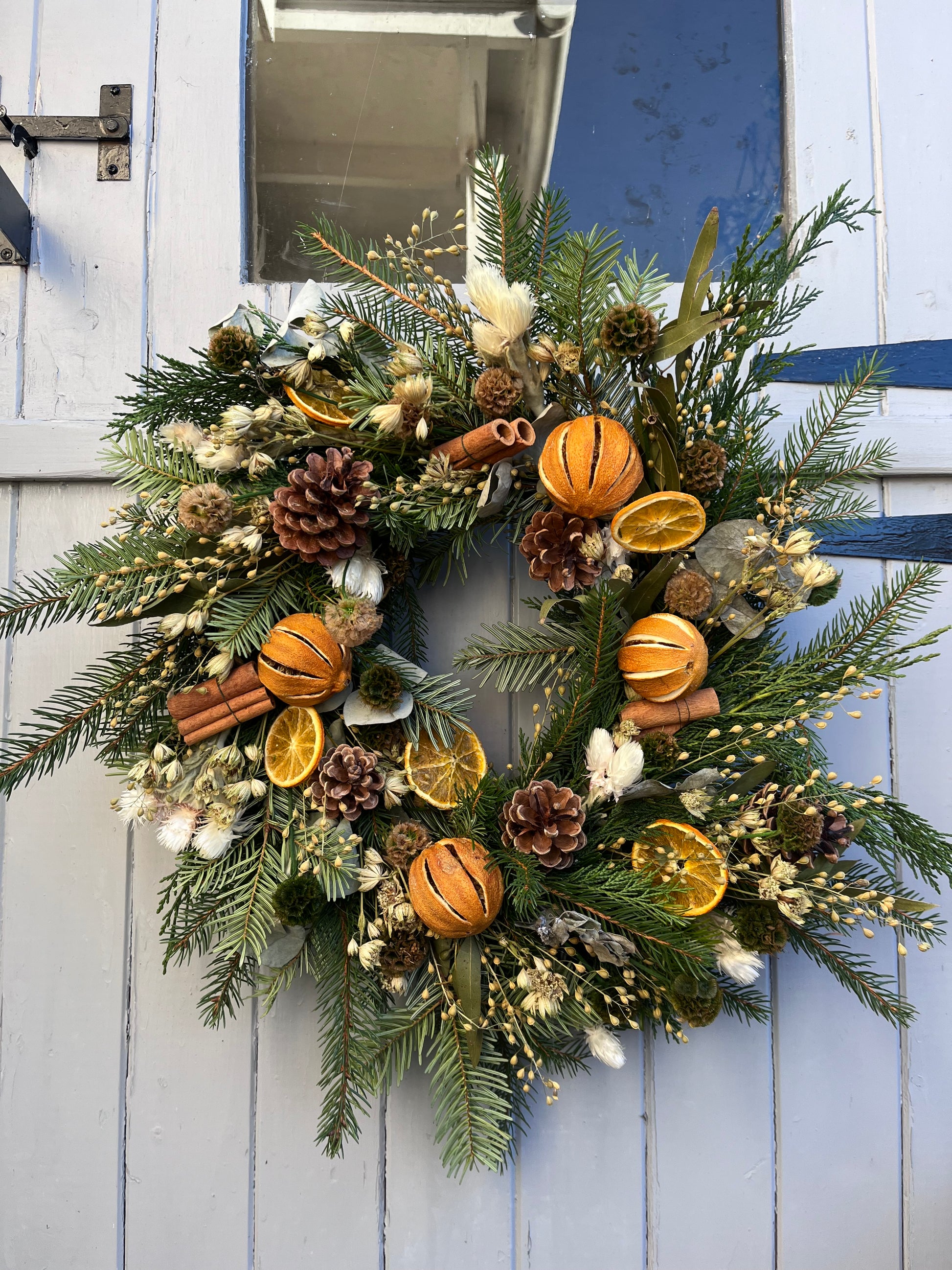 These beautiful handmade wreaths have been crafted with a mix of fresh evergreen foliage and dried flowers and fruits making them the prefect festive wreath.