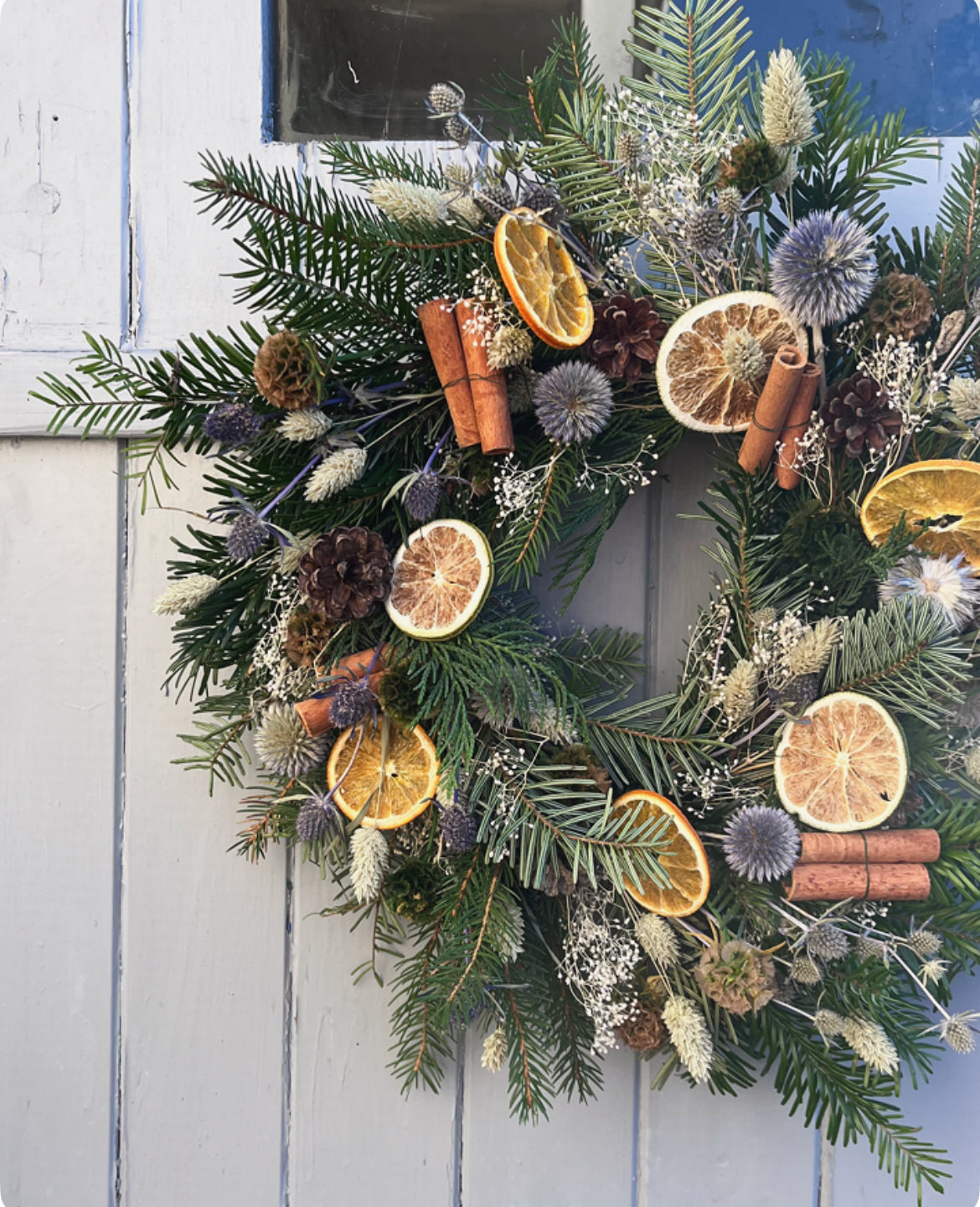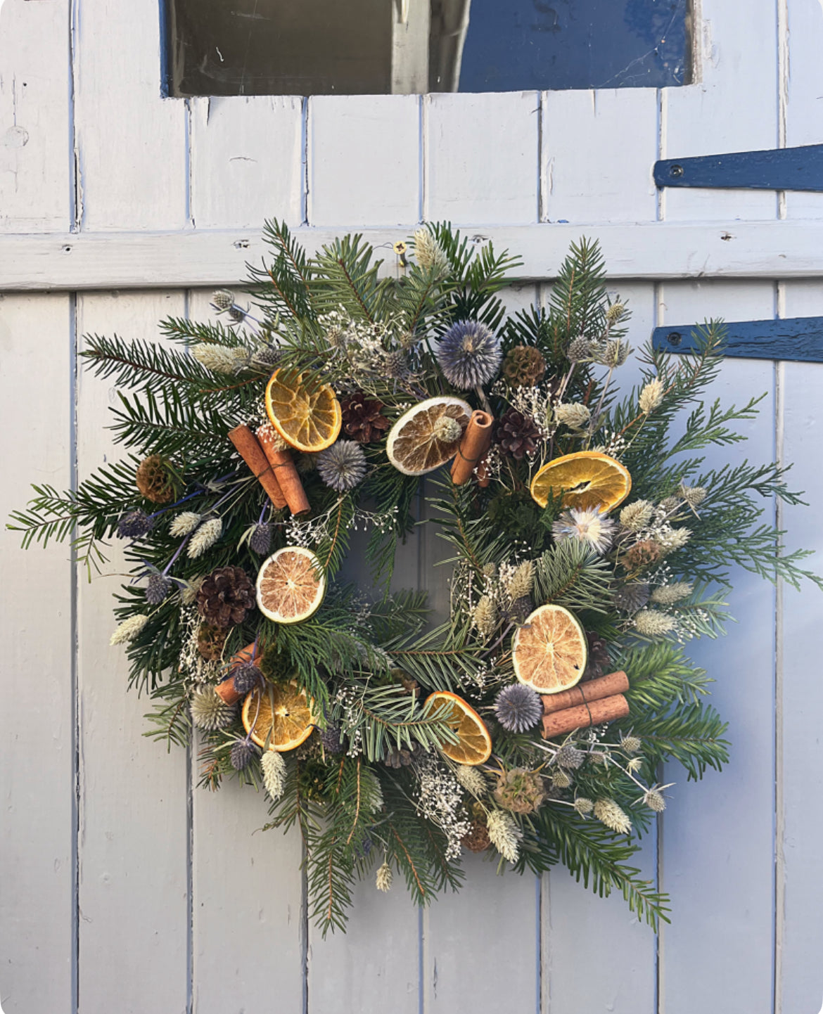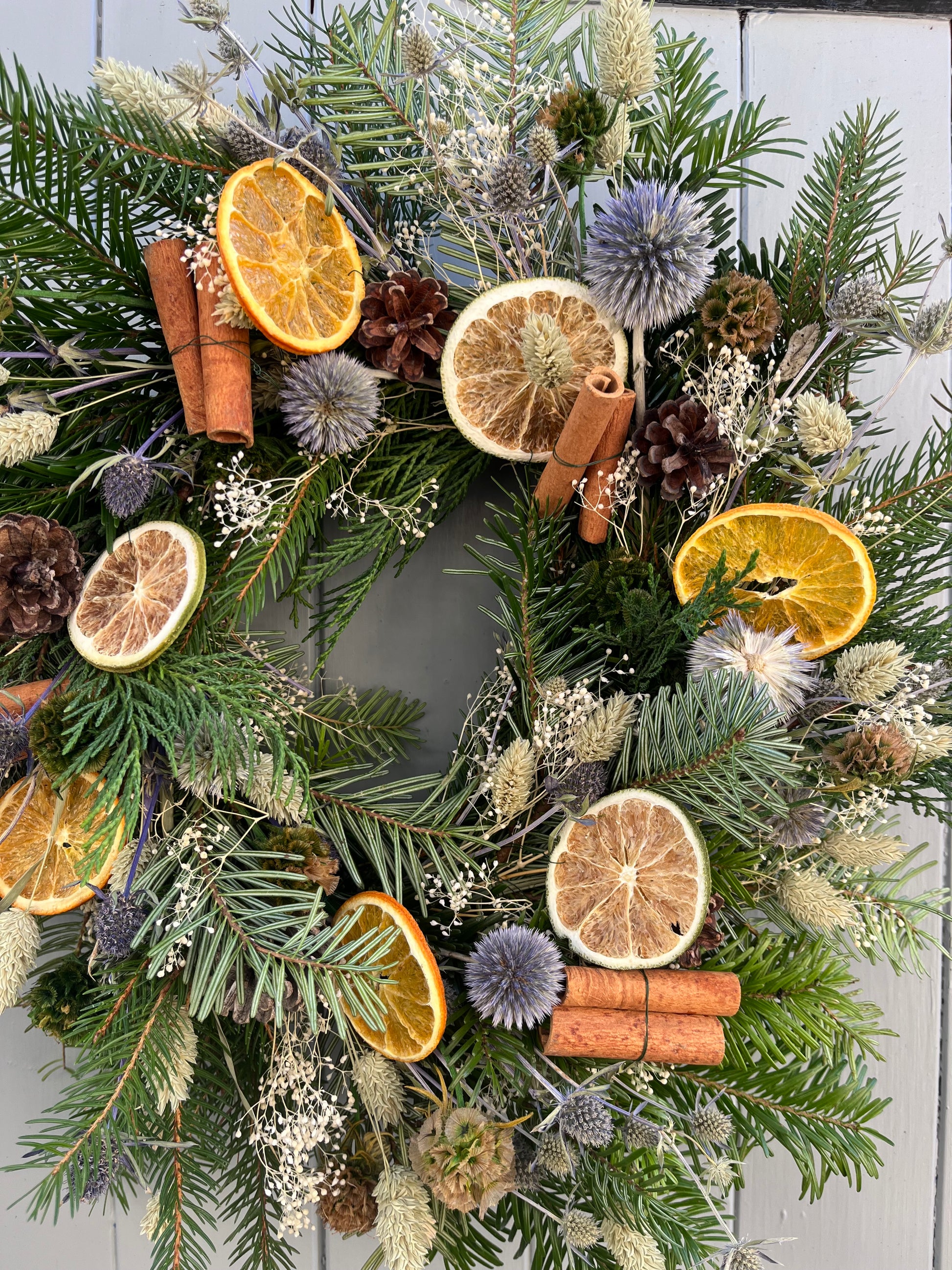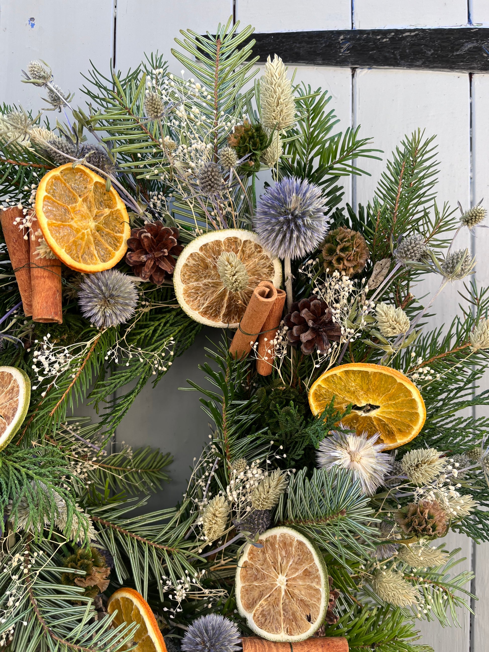 These beautiful handmade wreaths have been crafted with a mix of fresh evergreen foliage and dried flowers and fruits making them the prefect festive wreath.