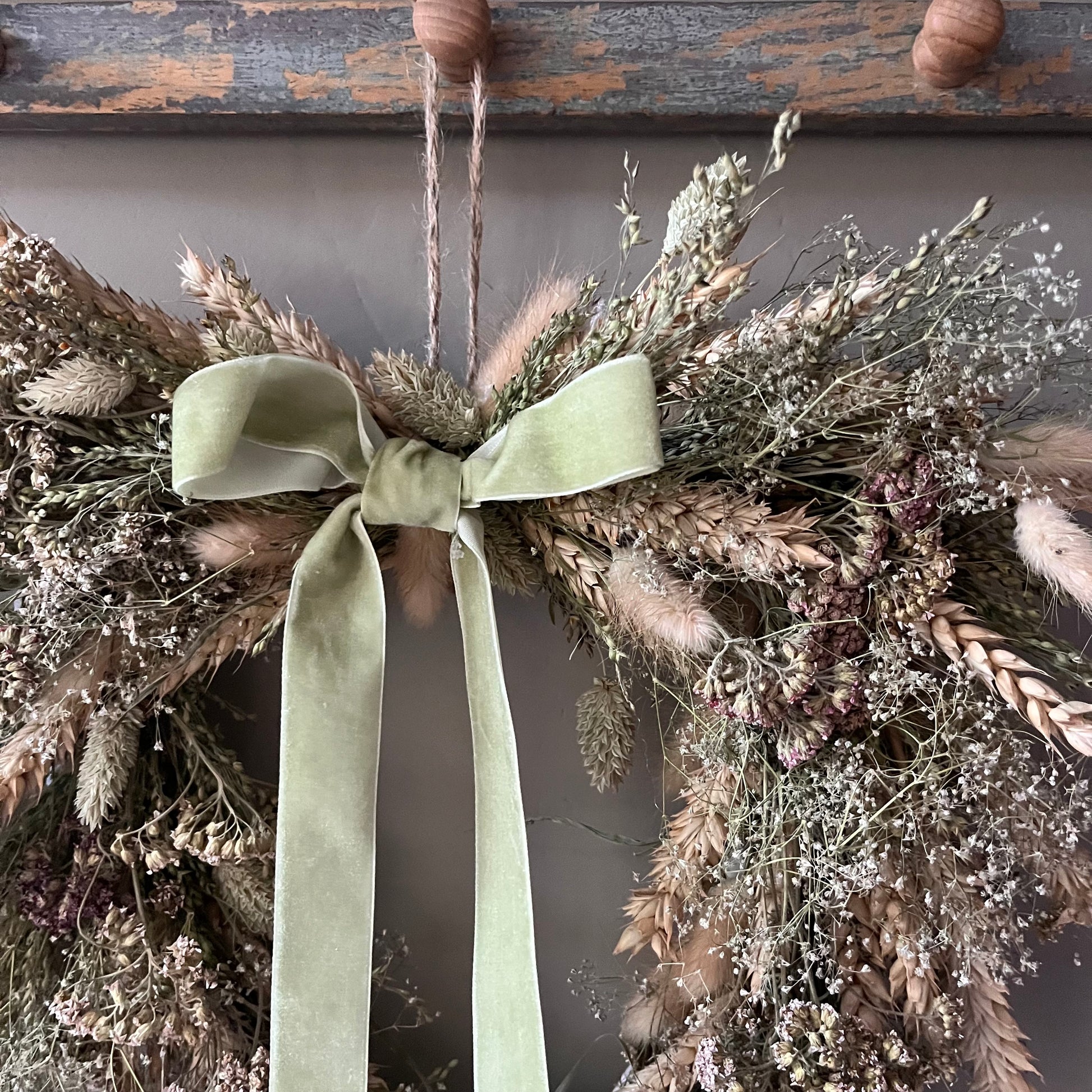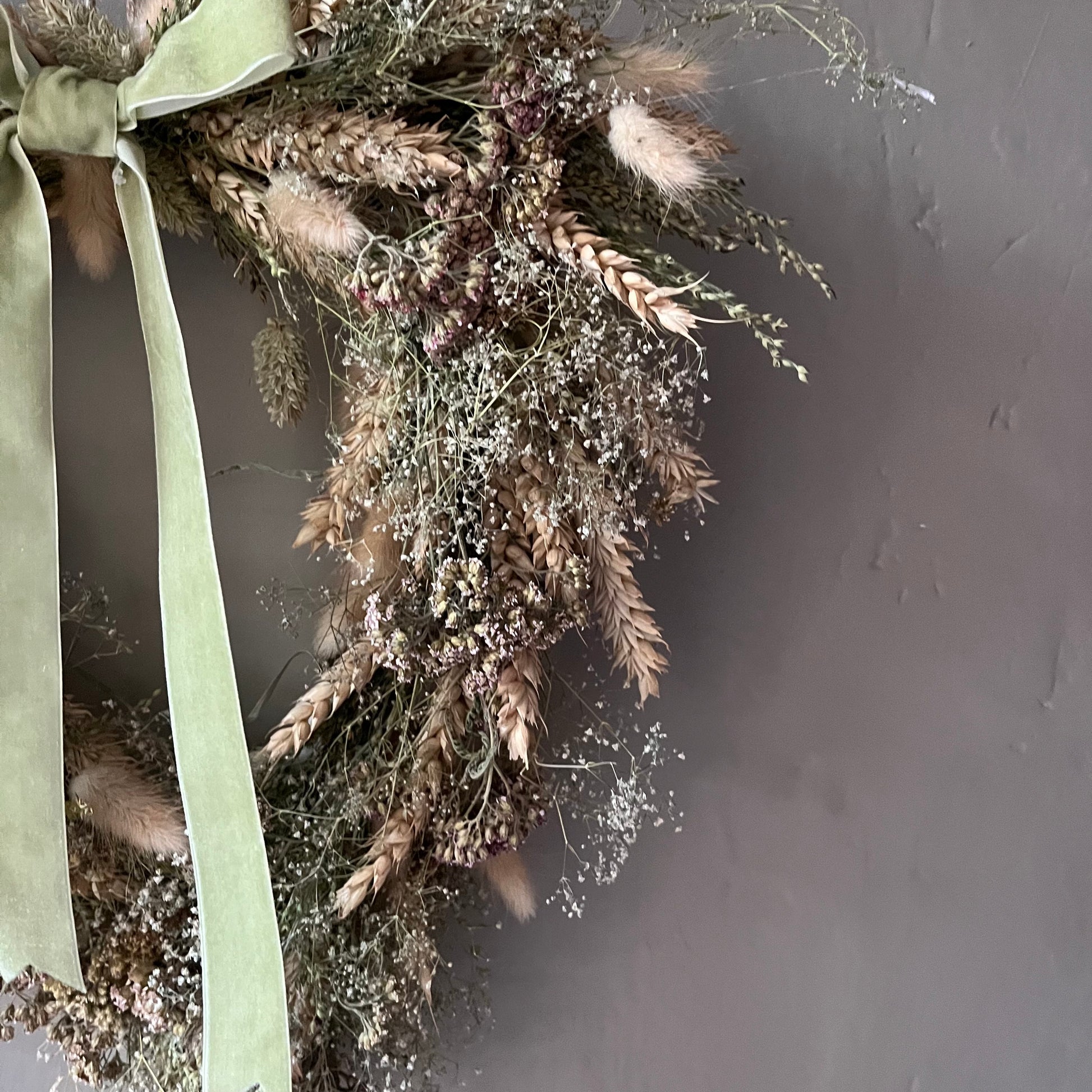 -Dried flower wreaths will not last if they are left outside to battle with the elements. If they get wet or blown about, they will more than likely break, and they won’t last as long. I would recommend hanging your wreath indoors. If you wish to hang it outside, I would do so in a place that has shelter from wind and rain, but this will shorten its lifespan.