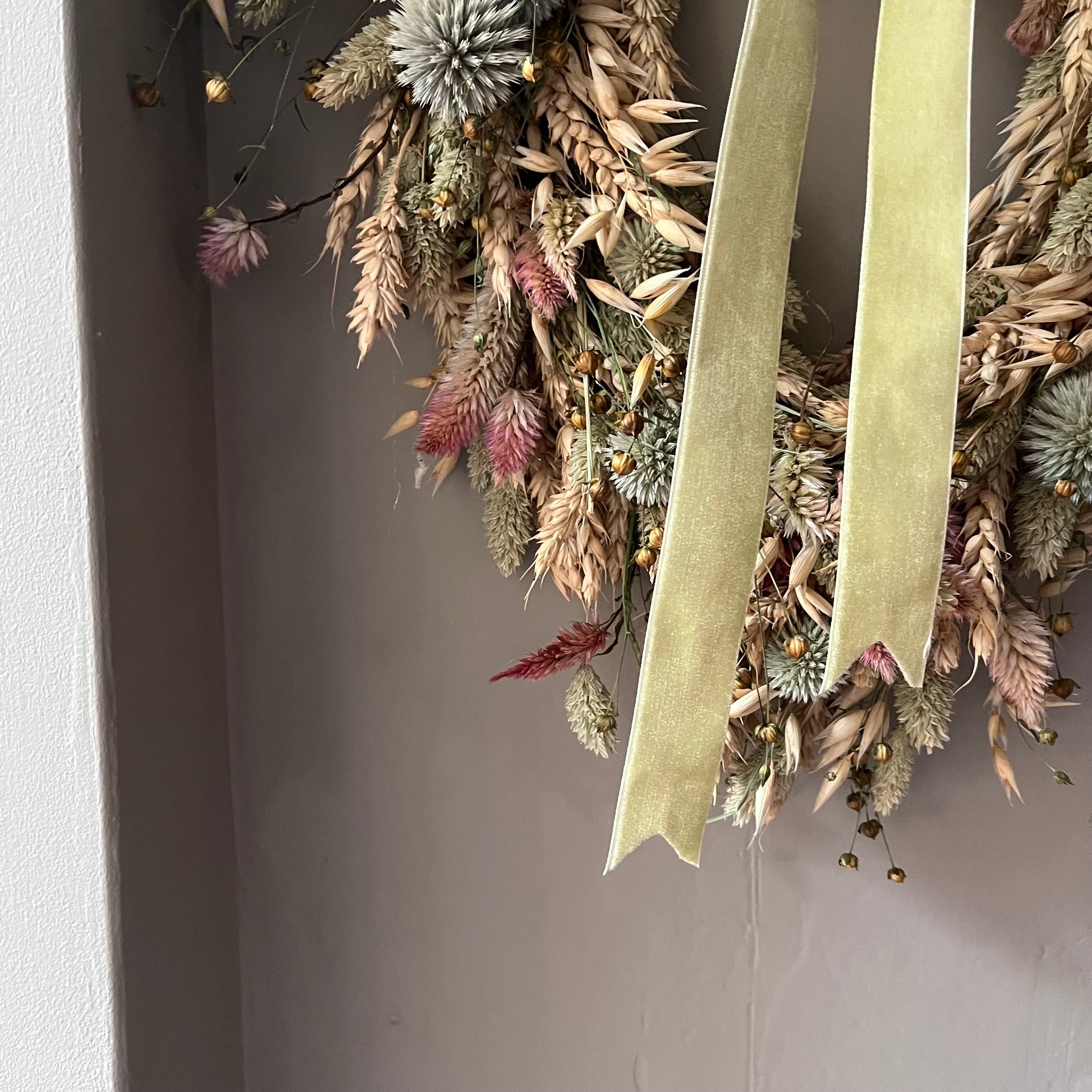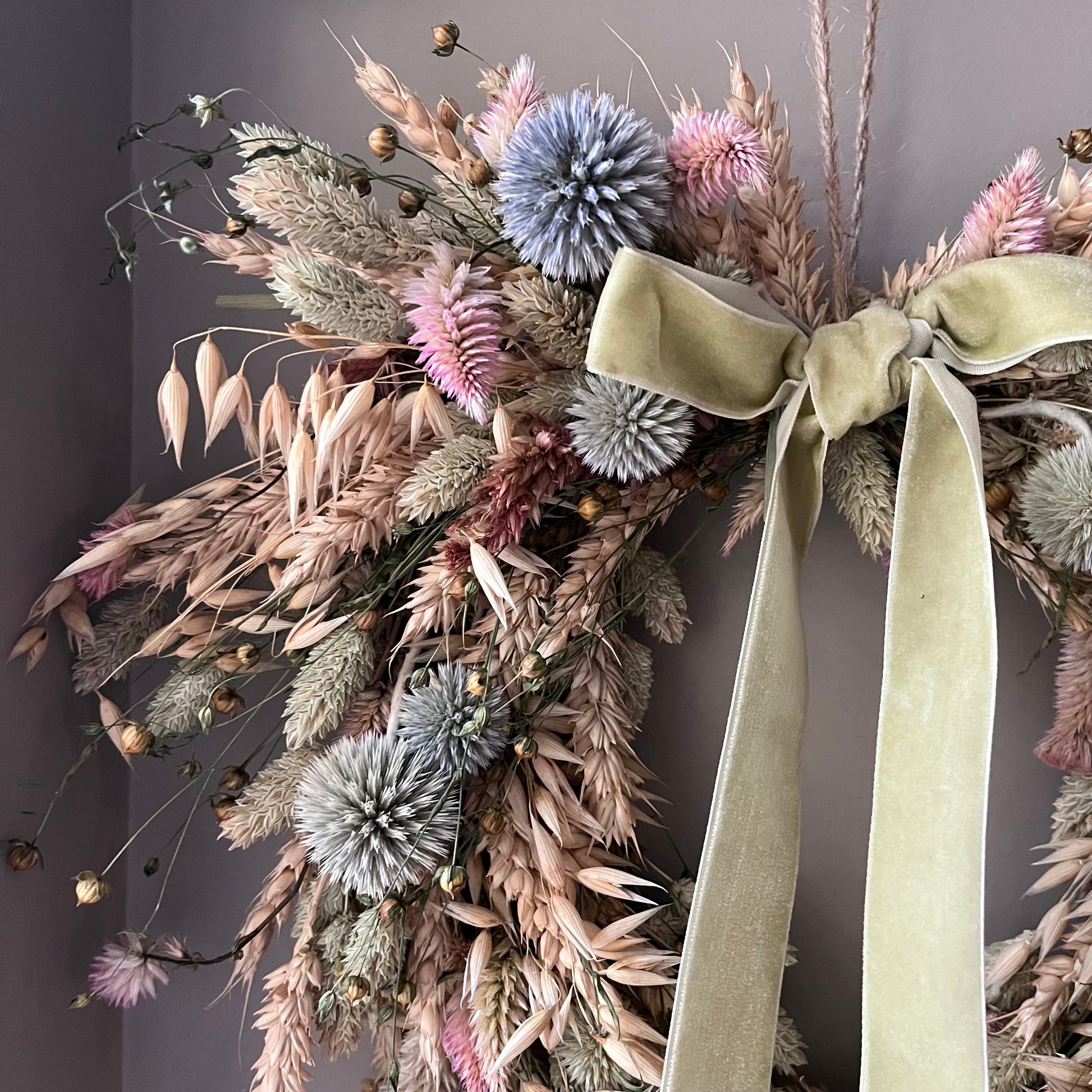 The wreath is handcrafted using dried flowers.