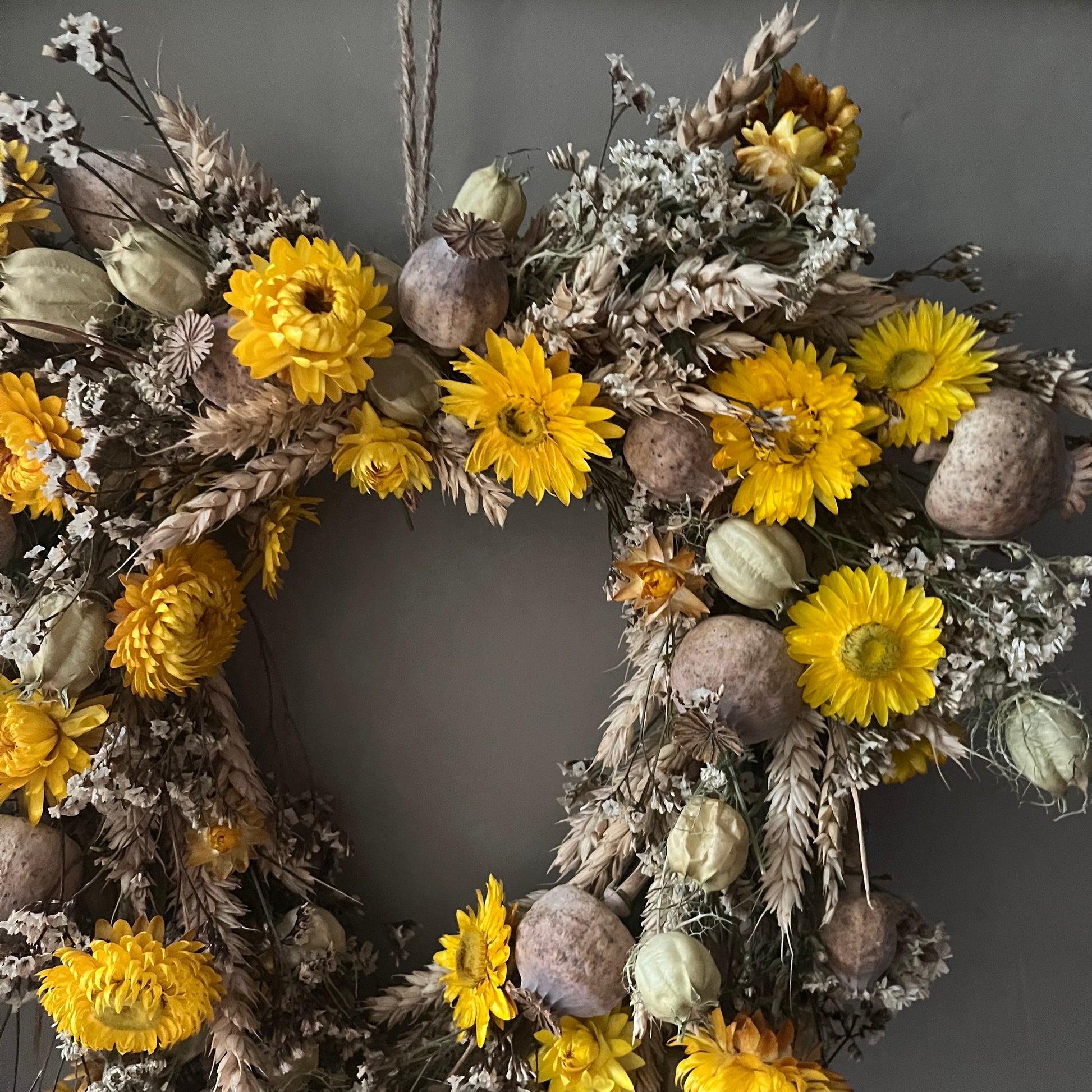 The wreath is handcrafted using dried flowers.