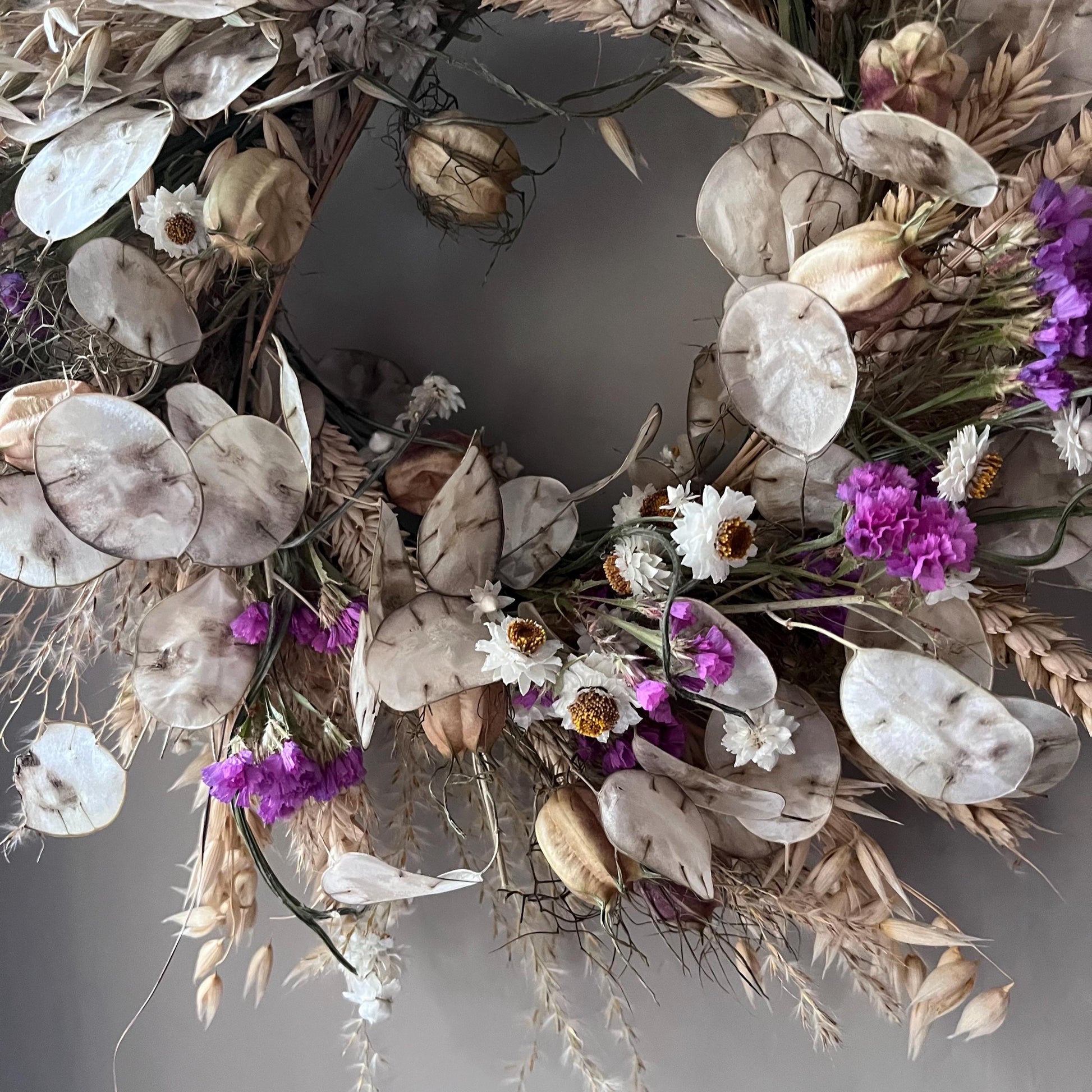 -Dried flower wreaths will not last if they are left outside to battle with the elements. If they get wet or blown about, they will more than likely break, and they won’t last as long. I would recommend hanging your wreath indoors. If you wish to hang it outside, I would do so in a place that has shelter from wind and rain, but this will shorten its lifespan.