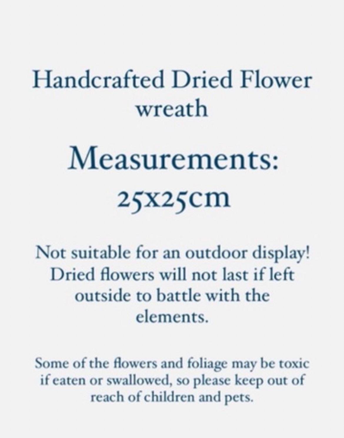 -Dried flower wreaths will not last if they are left outside to battle with the elements. If they get wet or blown about, they will more than likely break, and they won’t last as long. I would recommend hanging your wreath indoors. If you wish to hang it outside, I would do so in a place that has shelter from wind and rain, but this will shorten its lifespan.