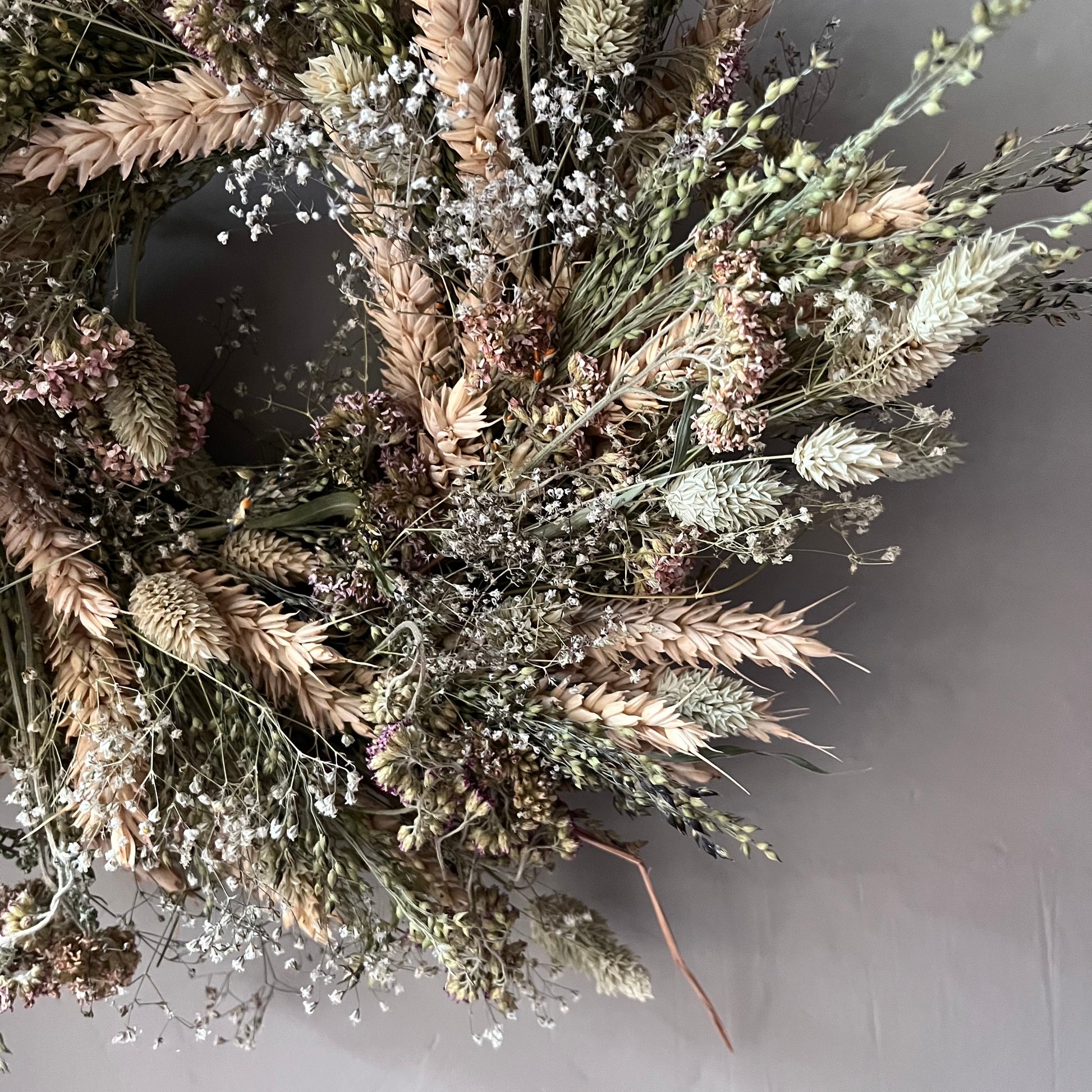 -Dried flower wreaths will not last if they are left outside to battle with the elements. If they get wet or blown about, they will more than likely break, and they won’t last as long. I would recommend hanging your wreath indoors. If you wish to hang it outside, I would do so in a place that has shelter from wind and rain, but this will shorten its lifespan.