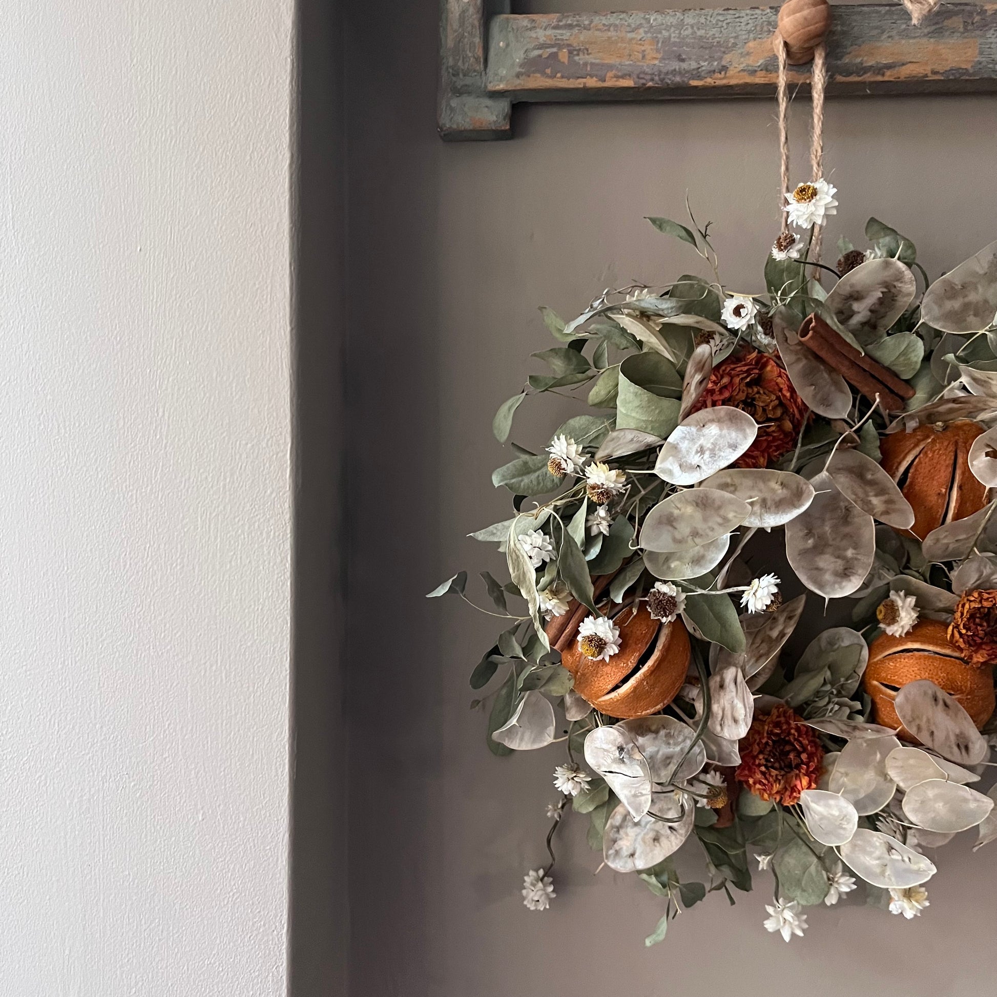-Dried flower wreaths will not last if they are left outside to battle with the elements. If they get wet or blown about, they will more than likely break, and they won’t last as long. I would recommend hanging your wreath indoors. If you wish to hang it outside, I would do so in a place that has shelter from wind and rain, but this will shorten its lifespan.