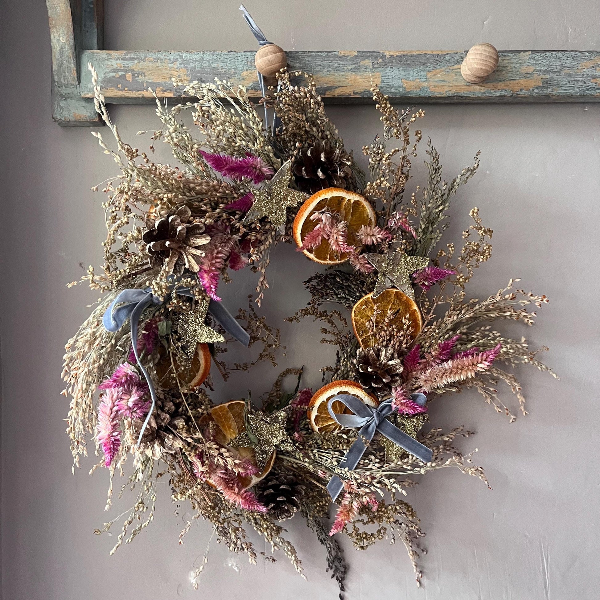 -Dried flower wreaths will not last if they are left outside to battle with the elements. If they get wet or blown about, they will more than likely break, and they won’t last as long. I would recommend hanging your wreath indoors. If you wish to hang it outside, I would do so in a place that has shelter from wind and rain, but this will shorten its lifespan.