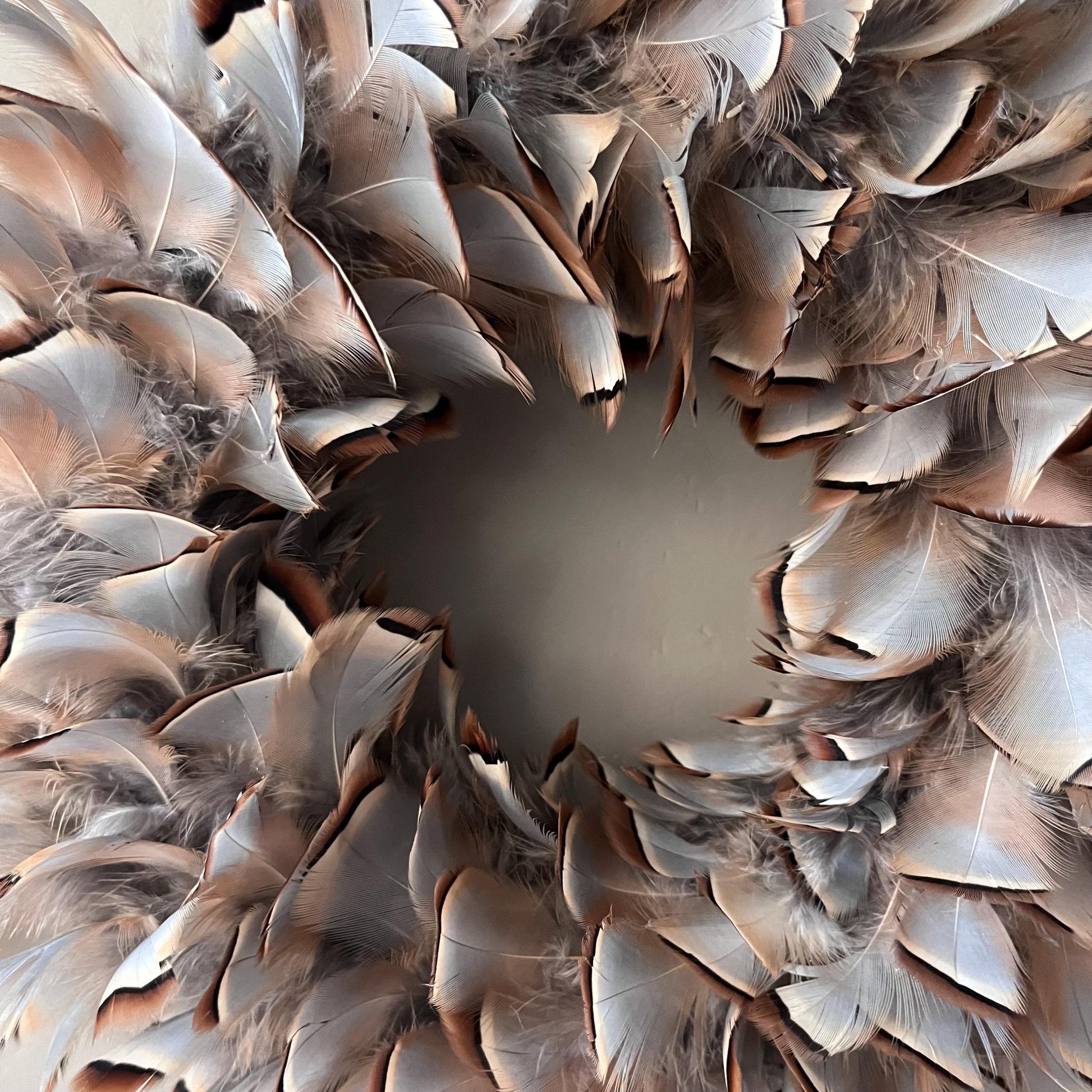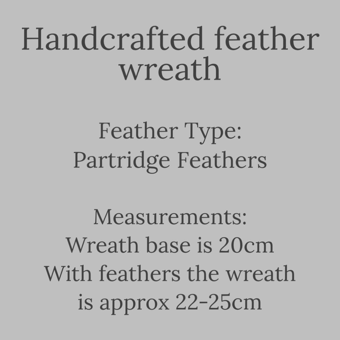 A beautiful feather wreath which is an eye catching statement piece. It is the perfect accessory for any home or occasion.