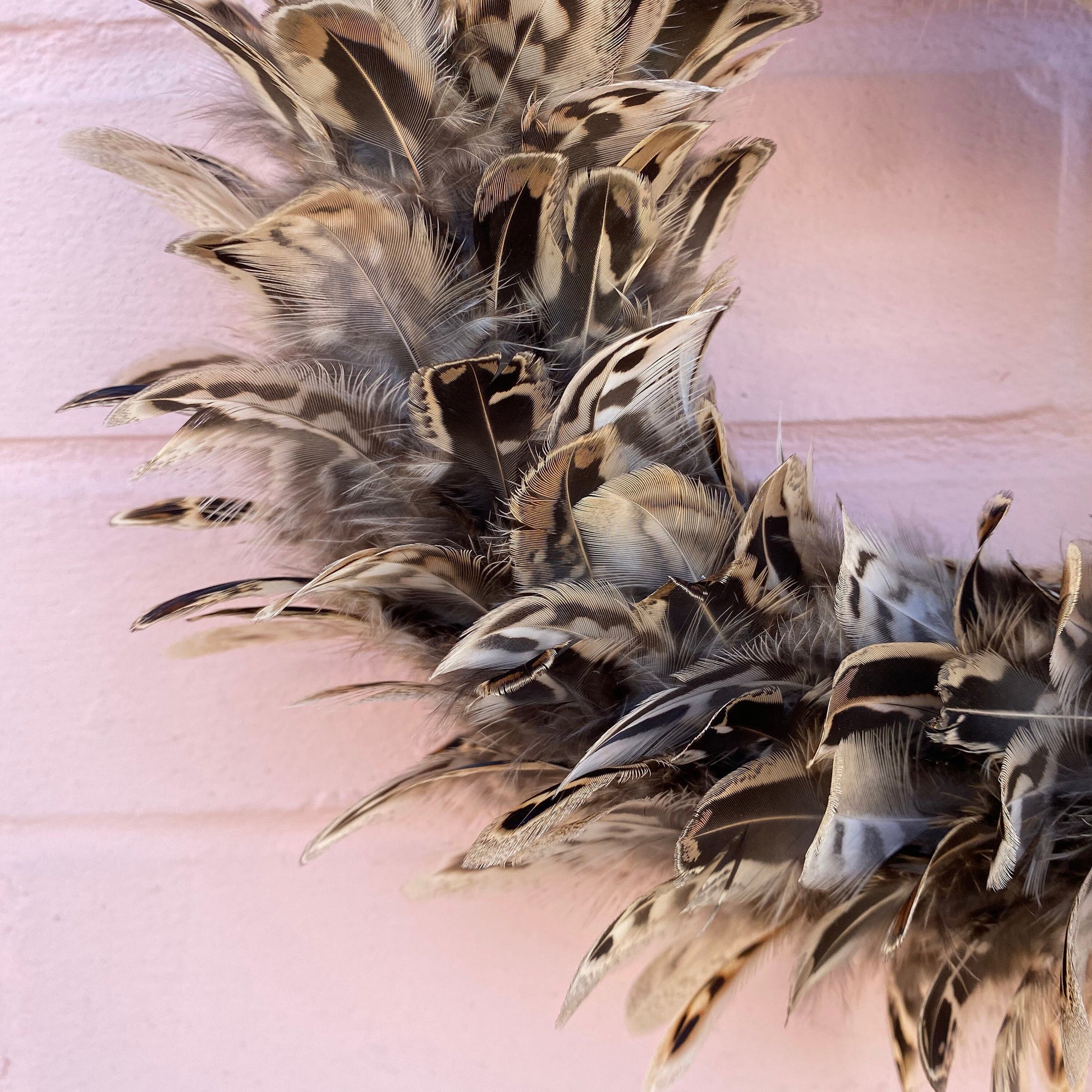 A beautiful feather wreath which is an eye catching statement piece. It is the perfect accessory for any home or occasion.