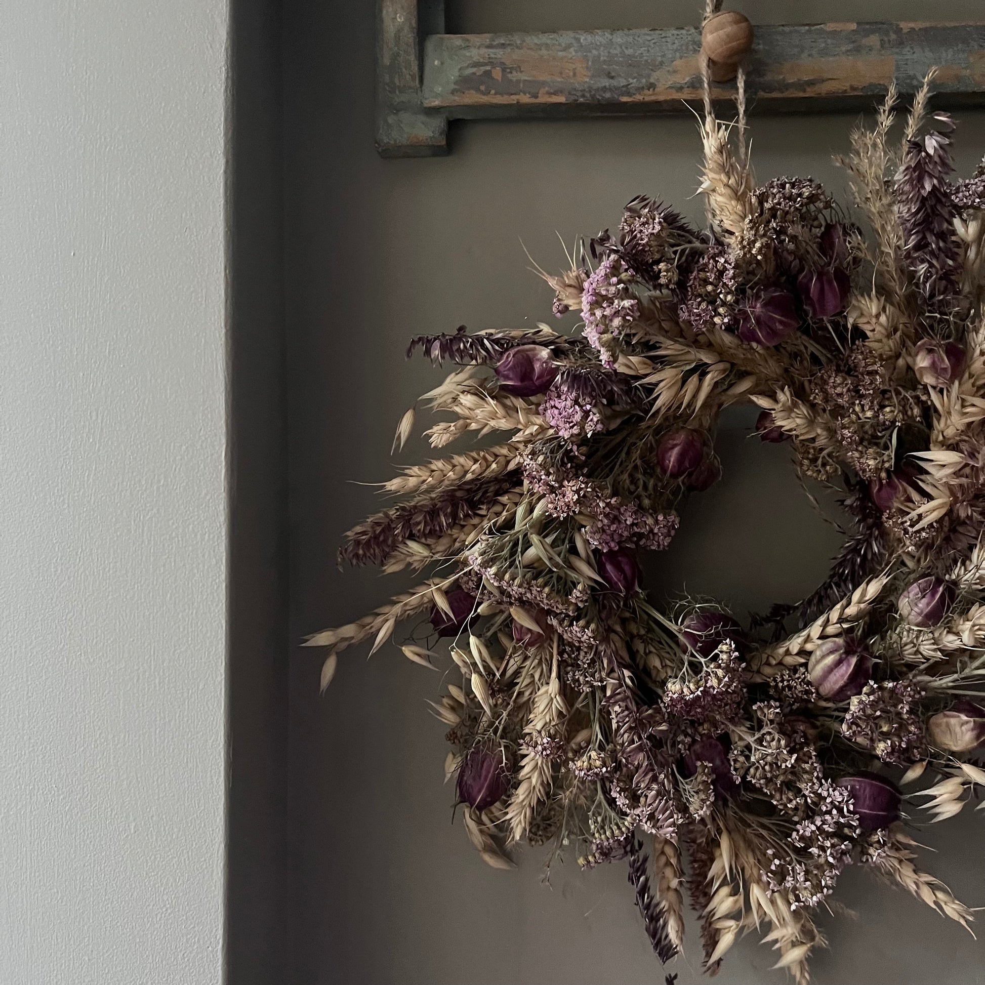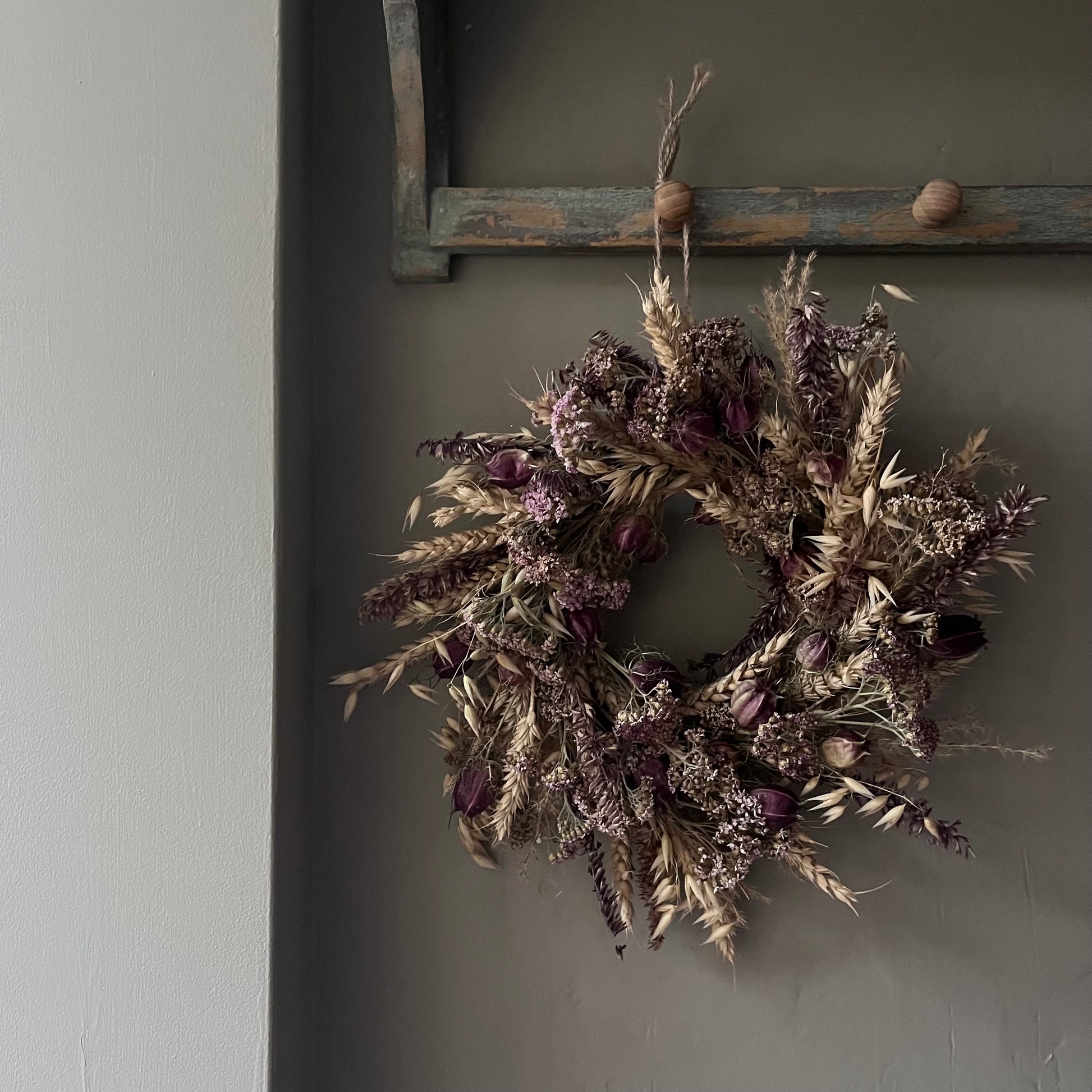 -Dried flower wreaths will not last if they are left outside to battle with the elements. If they get wet or blown about, they will more than likely break, and they won’t last as long. I would recommend hanging your wreath indoors. If you wish to hang it outside, I would do so in a place that has shelter from wind and rain, but this will shorten its lifespan.