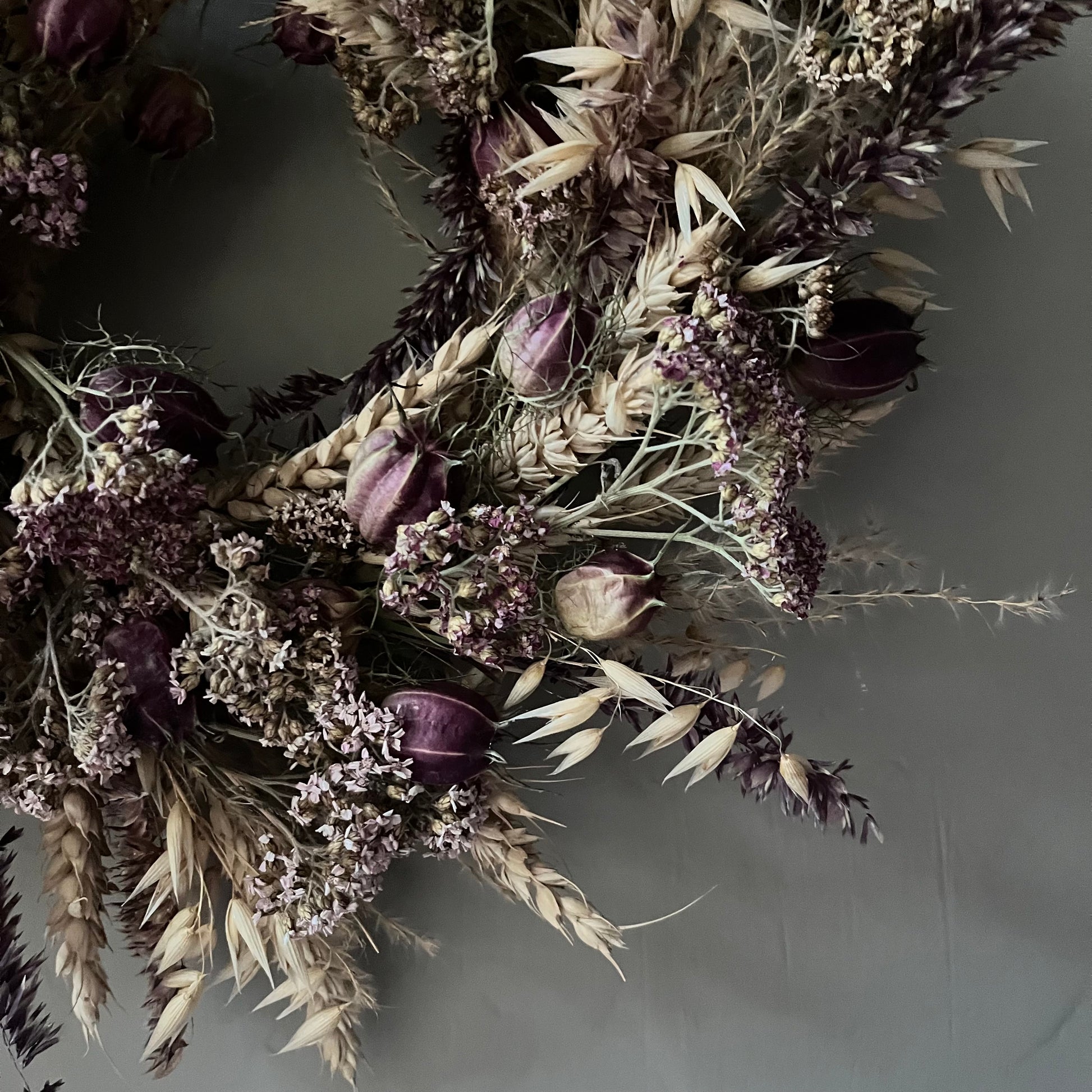 The wreath is handcrafted using dried flowers.
