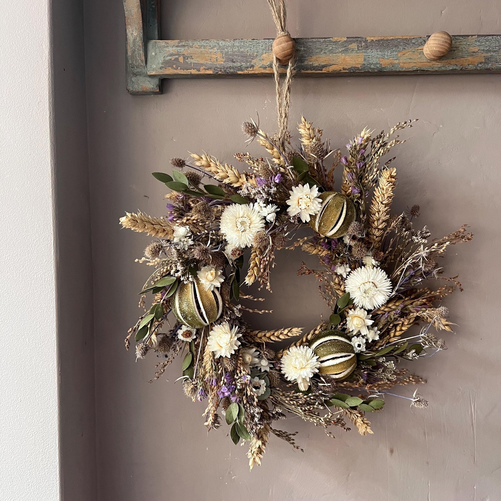 -Dried flower wreaths will not last if they are left outside to battle with the elements. If they get wet or blown about, they will more than likely break, and they won’t last as long. I would recommend hanging your wreath indoors. If you wish to hang it outside, I would do so in a place that has shelter from wind and rain, but this will shorten its lifespan.
