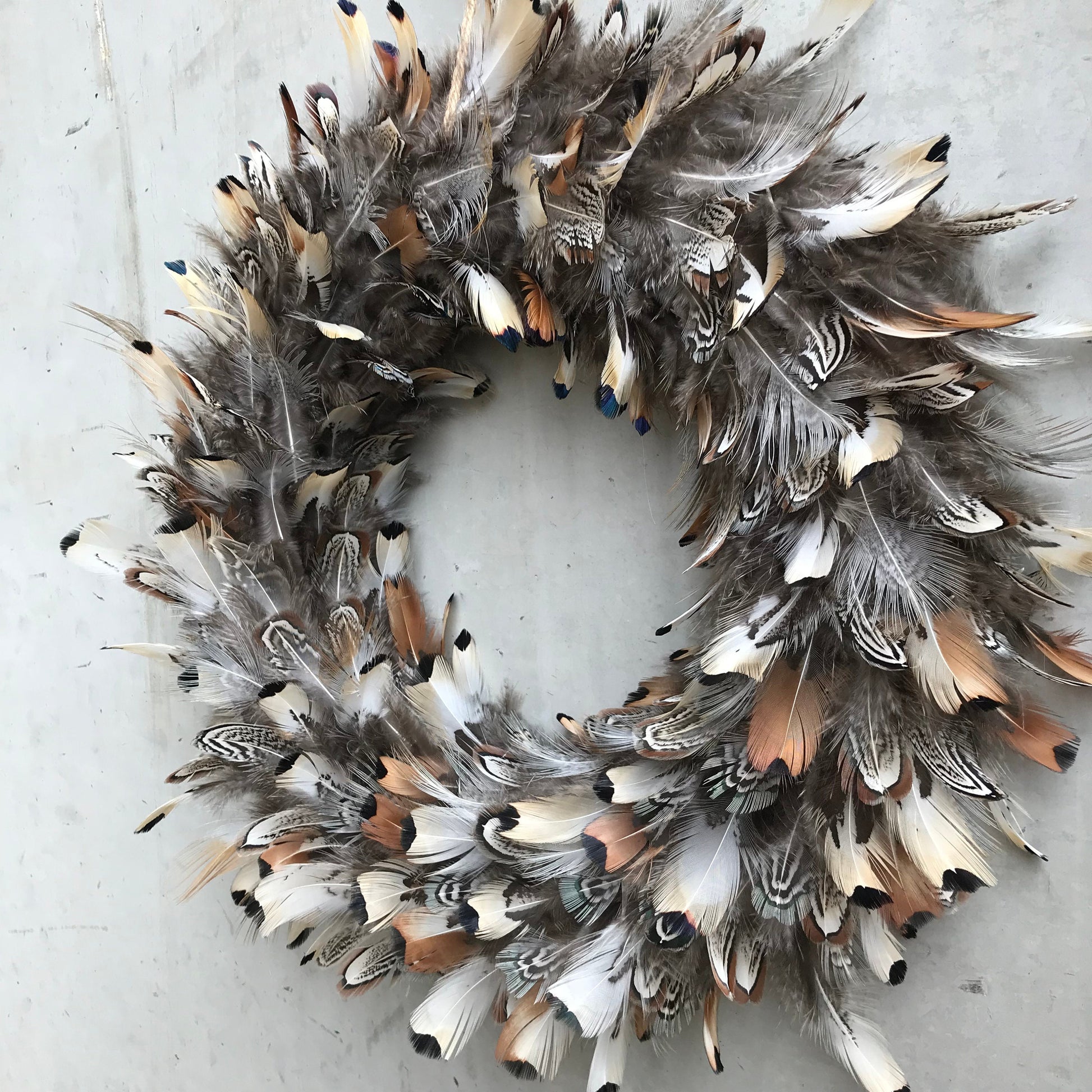 A beautiful feather wreath which is an eye catching statement piece. It is the perfect accessory for any home or occasion.